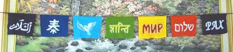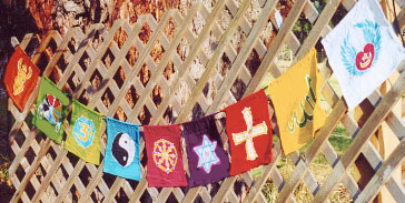 9 flags on a string with symbols of more major religions, including Goddess, Native American, Hindu, Buddhist, Taoist, Jewish, Christian, Islamic, Sufi. Flags sewn on a string, hand batiked rayon.