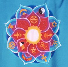 A mandala of symbols of 16 of the world's spiritual traditions, designed for honoring all paths to truth. Includes Jewish Star of David, Buddhist Prayer Wheel, Native American Medicine Wheel, Christian Cross, Hindu Om, Great Goddess, Taoist Ying Yang, Islamic moon and star, Winged Sufi Heart, Sikh symbol, Baha'i star, African Goddess, Zoroastrian Flame, Confucian circle and dot, Wiccan pentacle, and Egyptian Ankh. 3' x 3'